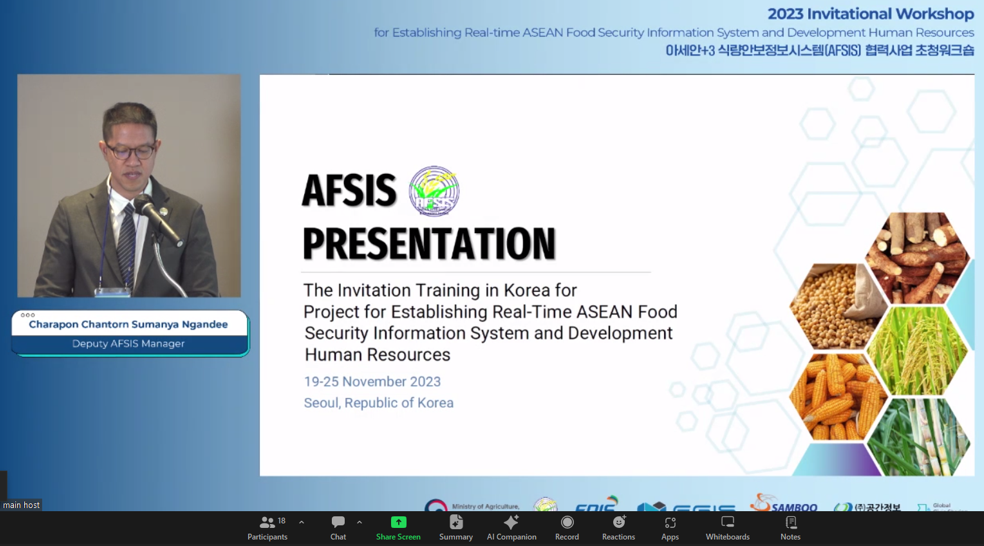 The Invitational Workshop on the Project for Establishing Real-Time ASEAN Food Security Information System (AFSIS) and Development Human Resources, hosted by the Korea Agency of Education, Promotion, and Information Service in Food, Agriculture, Forestry, and Fisheries (EPIS) with the collaboration of the AFSIS Secretariat, was held in Seoul, the Republic of Korea, on November 20–25, 2023.