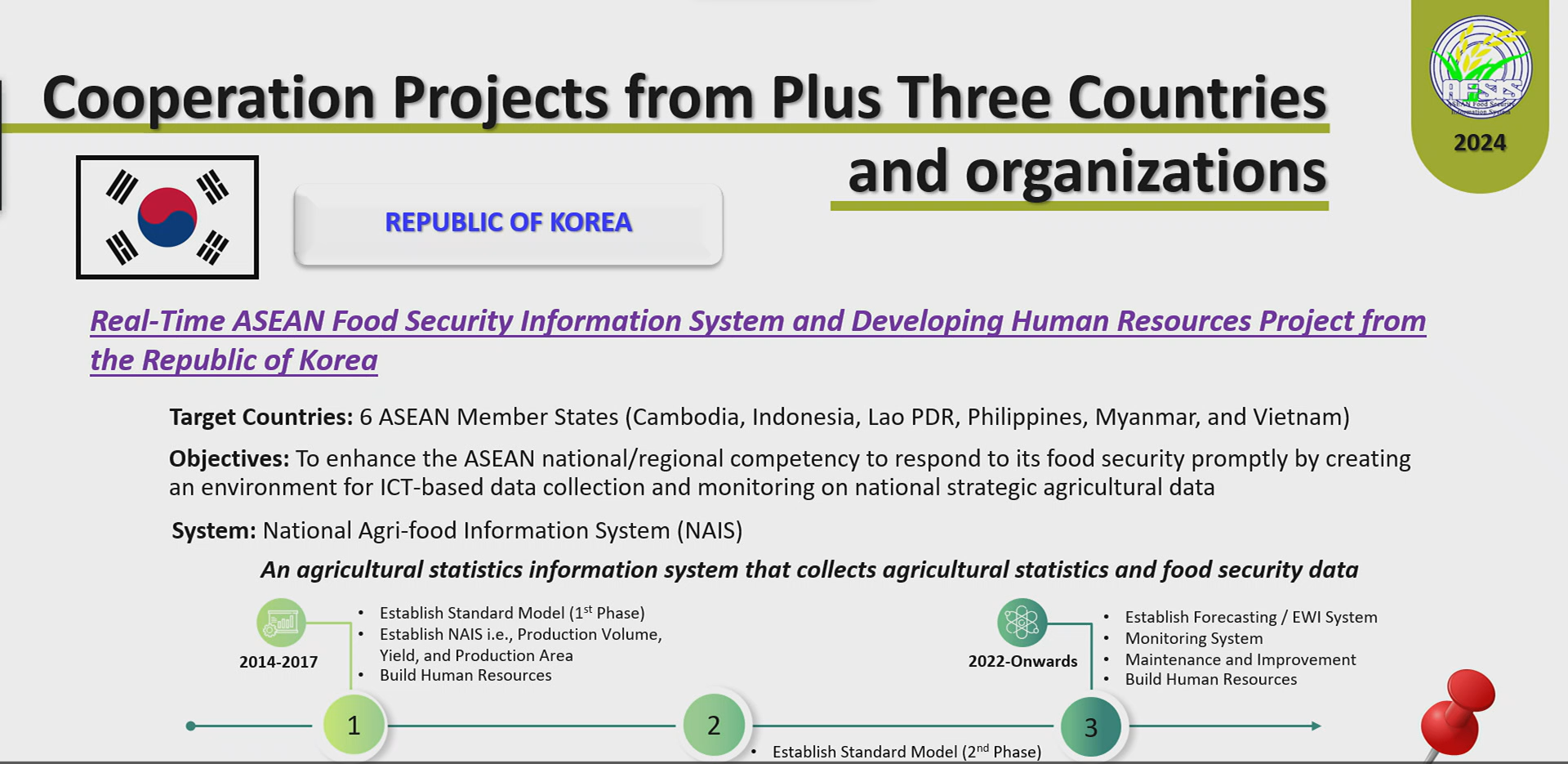 AFSIS and Development of Human Resources" in Cambodia On 27 November 2025, Mr. Charapon Chantorn, Deputy AFSIS Manager, participated in the Completion and Handover Ceremony of the project “Establishing the Real-Time ASEAN Food Security Information System (AFSIS) and Development of Human Resources, Phase 3 – Pilot Project on Strategic Crop Forecasting System for Food Security in Cambodia.” The ceremony was held in Phnom Penh, Cambodia, and jointly hosted by the Ministry of Agriculture, Food and Rural Affairs (MAFRA) of the Republic of Korea, the Ministry of Agriculture, Forestry and Fisheries (MAFF) of Cambodia, and the Korea Rural Community Corporation (KRC).