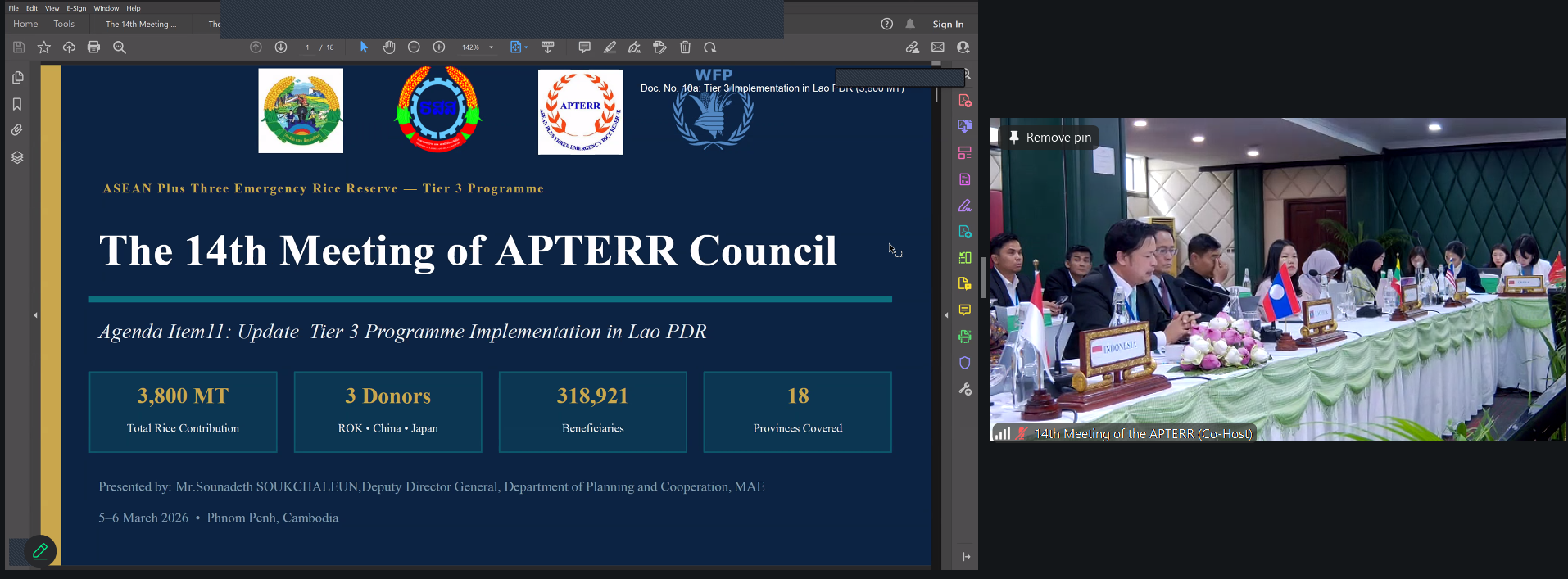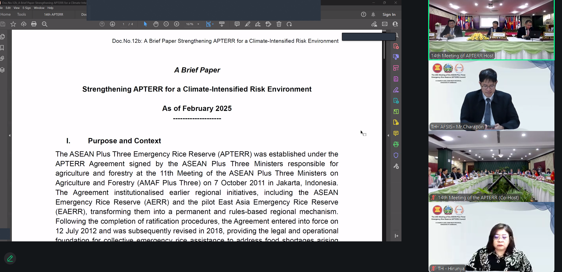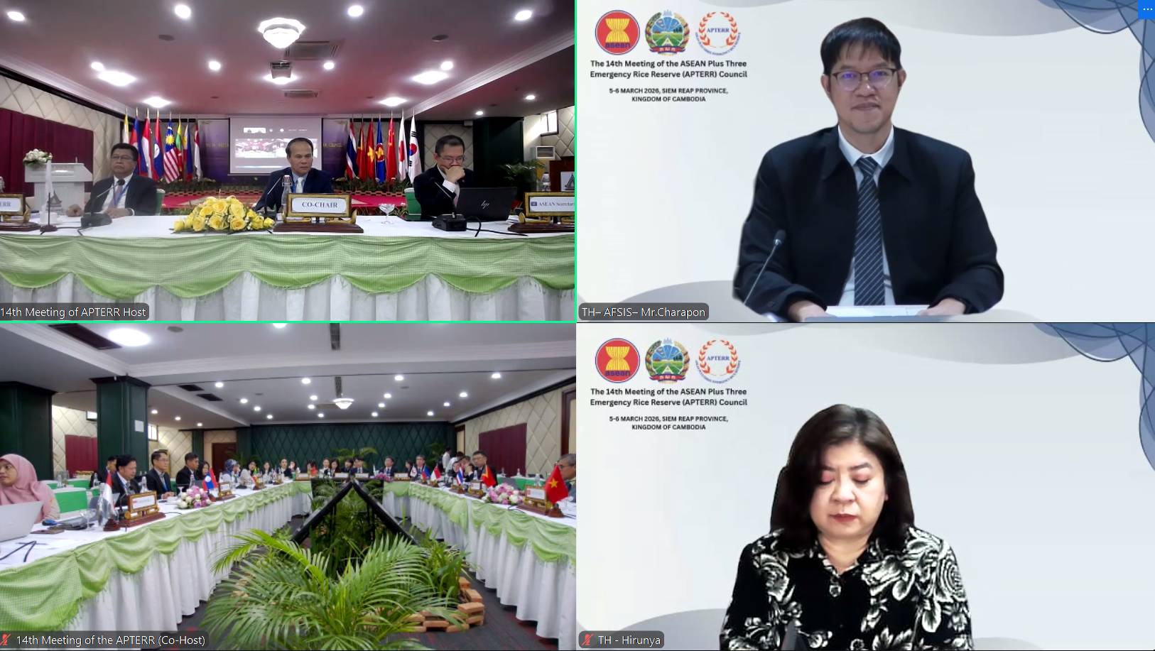 On 5–6 March 2026, the AFSIS Secretariat participated in the 14th Meeting of the ASEAN Plus Three Emergency Rice Reserve (APTERR) Council via video conference, hosted by the Kingdom of Cambodia. The meeting brought together representatives from ASEAN Plus Three countries, the ASEAN Secretariat, the ASEAN Food Security Reserve Board (AFSRB), the Asian Development Bank (ADB), the APTERR Secretariat, and the AFSIS Secretariat to discuss key issues related to regional food security and emergency rice reserves.