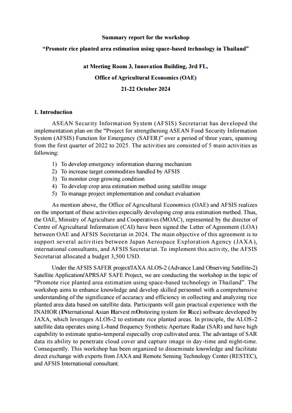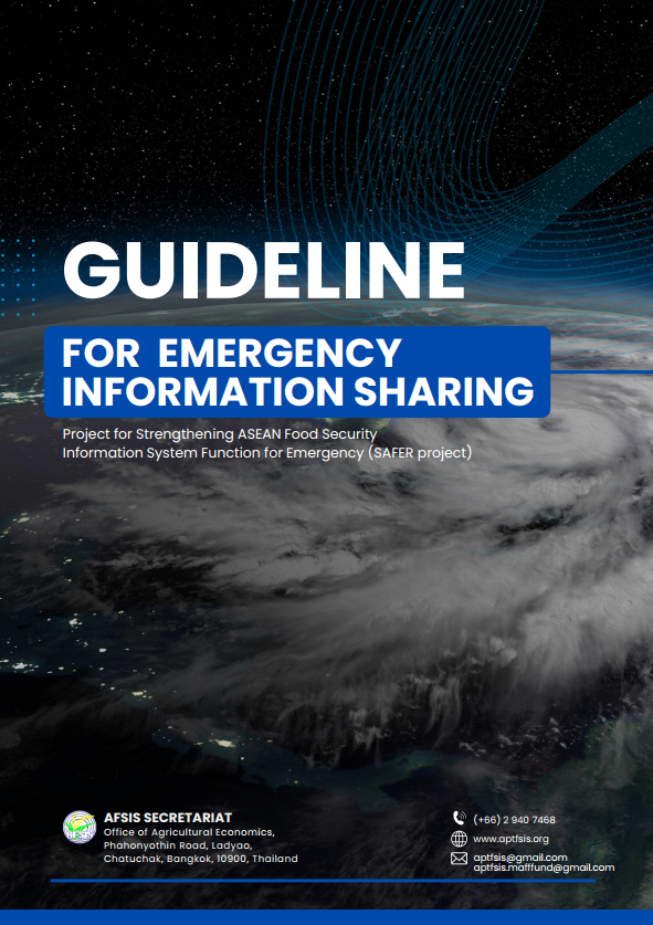 Since 2020, the AFSIS Secretariat has been sharing emergency information updates on agricultural damage caused by natural disasters in ASEAN member states through the "Report and Disseminate Information Regarding the Serious Disaster" project on the AFSIS website since 2020. The activity is to monitor the impact of serious disaster on food security of ASEAN member countries and to provide accurate and timely data regarding serious disasters situation to help inform response, policy-making and recovery efforts across ASEAN member countries. Under this project, AFSIS Secretariat developed the data collection guideline for AFSEAN Member States (AMS) for more systematic disaster reporting system and serves as a comprehensive resource for advancing food security through better disaster response mechanisms and supports timely policy-making across the region.