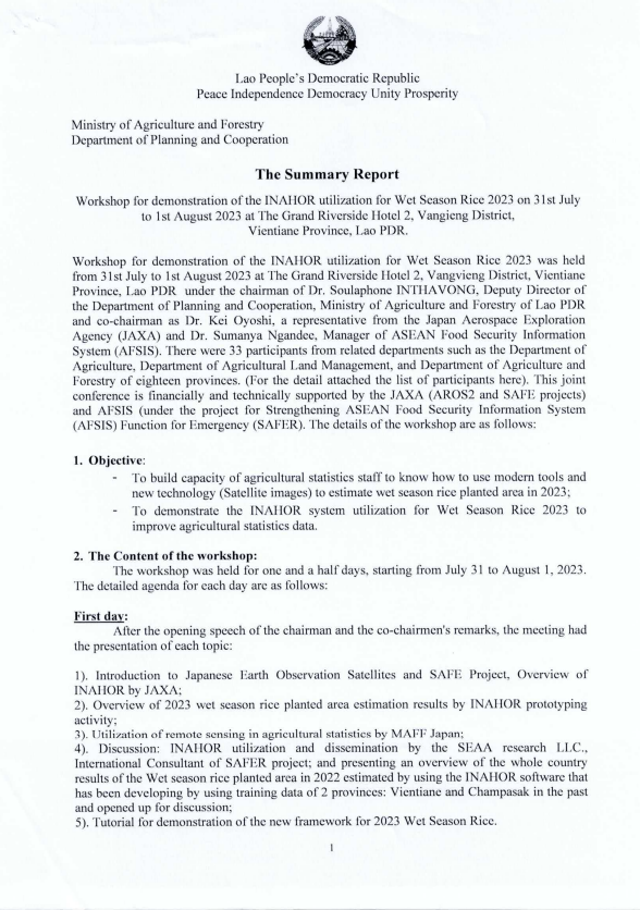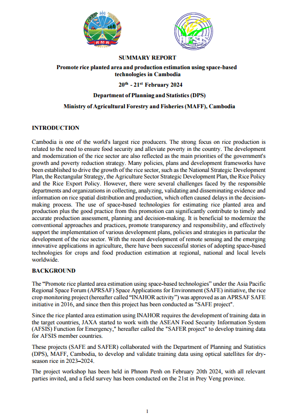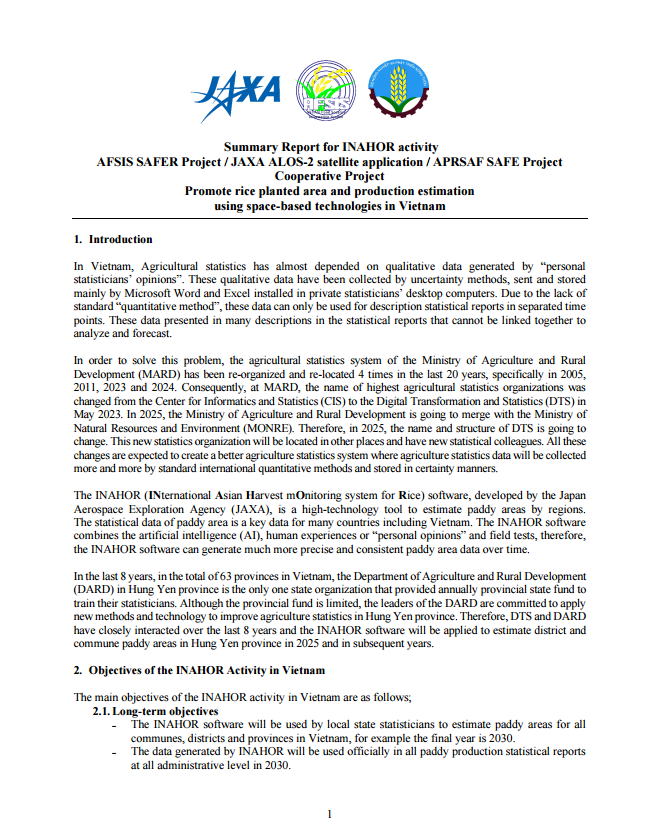 This output focuses on strengthening the capacity of officers from ASEAN Member Countries, in collaboration with JAXA and RESTEC, to develop the necessary skills to operate the INAHOR system using satellite imagery (ALOS-2 data) for estimating rice cultivation areas in target regions. Upon completion of the training, participants are expected to be able to prepare training data for INAHOR, estimate rice cultivation areas in their respective countries, and generate corresponding maps using the software. Furthermore, they will be equipped with the knowledge and capability to adopt and integrate satellite-based technologies into agricultural statistics within their national statistical systems. The AFSIS Secretariat conducted both regional workshops for member countries and in-countries activity in Lao PDR, Cambodia in 2023, Thailand and Vietnam in 2024, and Indonesia and Myanmar in 2025, respectively.
