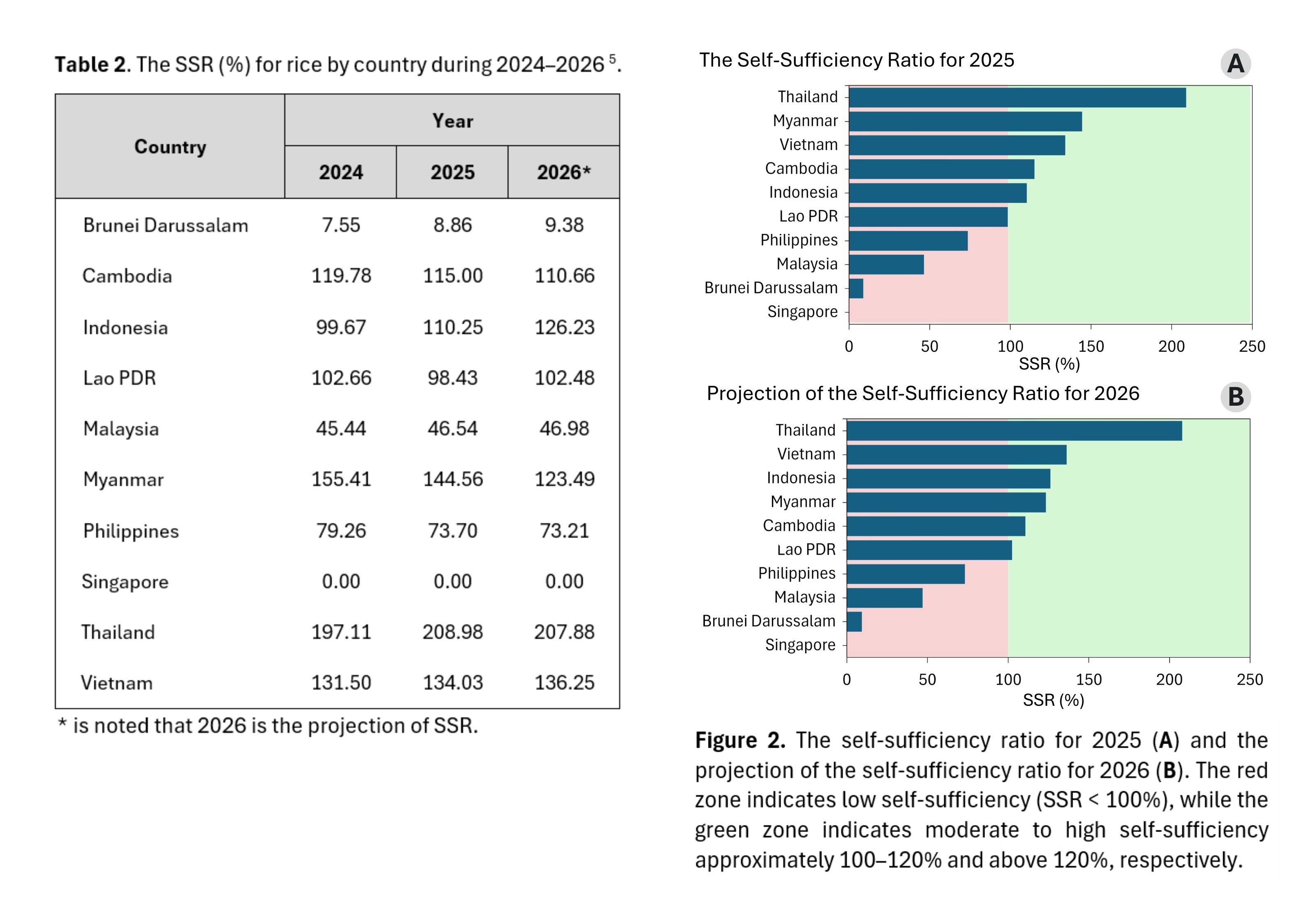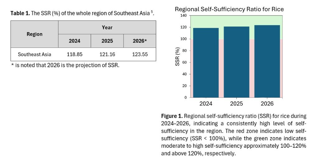 Rice is one of the most important staple food grains for the global population, providing essential energy as well as key nutrients such as minerals and vitamins 1. Southeast Asia is one of the world’s most important rice-producing regions, contributing approximately 40% of global rice exports 2. However, countries in the region may face increasingly unpredictable situations, including natural disasters and challenges related to production factors. The Self Sufficiency Ratio (SSR) as an indicator that measures the extent to which a country can meet its food needs from domestic production. It represents the proportion of locally produced food relative to the total food supply available for consumption (including imports and exports), and is typically calculated as production divided by total domestic supply, multiplied by 100 3. The SSR is widely used to assess food security, support policy planning, and enable global comparisons, as it reflects food availability and nutritional adequacy. A high SSR indicates that a country produces more than it consumes, while a low SSR indicates reliance on imports 4. At the regional level, SSR in Southeast Asia shows that most countries produce more rice than they consume during the period from 2025 to 2026. The regional SSR increased slightly from 121.16% in 2025 to 123.55% in 2026, representing a 2.39 percentage point increase (Table 1 and Figure 1).