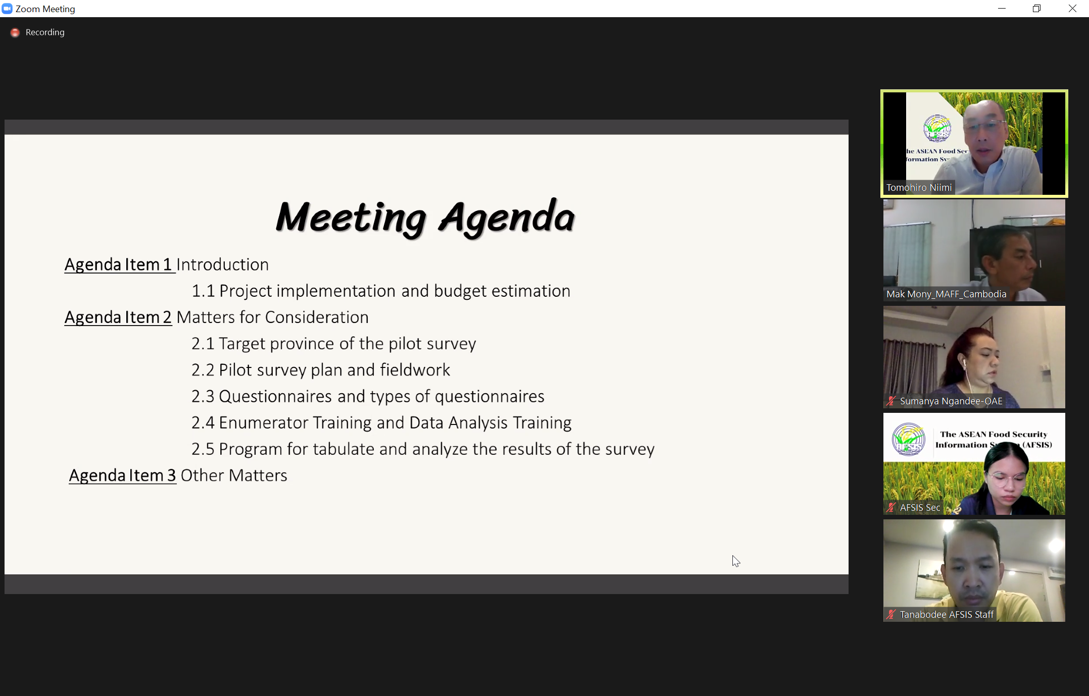 On 1 September 2021, the Department of Planning and Statistics (DPS), Ministry of Agriculture Forestry and Fisheries (MAFF), the Kingdom of Cambodia, together with AFSIS Secretariat had conducted the virtual meeting of the 1st meeting in Cambodia as a part of the Project for Supporting Agricultural Survey on Promoting Sustainable Agriculture in ASEAN Region (SAS-PSA) for the 3rd year project (2022). According to the Letter of Agreement (LoA) between AFSIS Secretariat and the DPS, MAFF of Cambodia, it was signed on 25 August 2021.