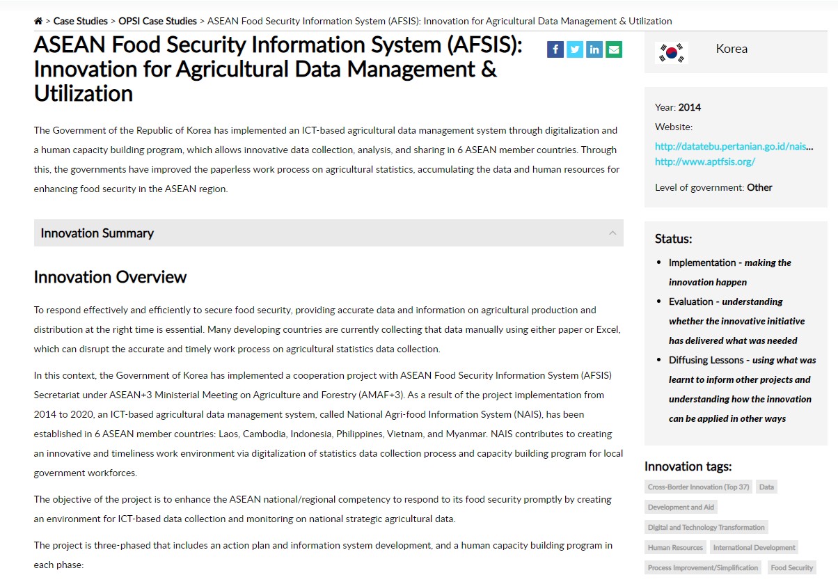 On the 20 September 2021, the National Agri-food Information System (NAIS) project has been successfully published on the website of Observatory of Public Sector Innovation (OPSI). This project was the implementation by the ASEAN Food Security Information System (AFSIS) in cooperation with EPIS, Ministry of Agriculture, Food, and Rural Affairs, South Korea to conduct an ICT-based agricultural data management system in 6 ASEAN member countries namely Indonesia, Lao PDR, Cambodia, Philippines, Vietnam, and Myanmar.